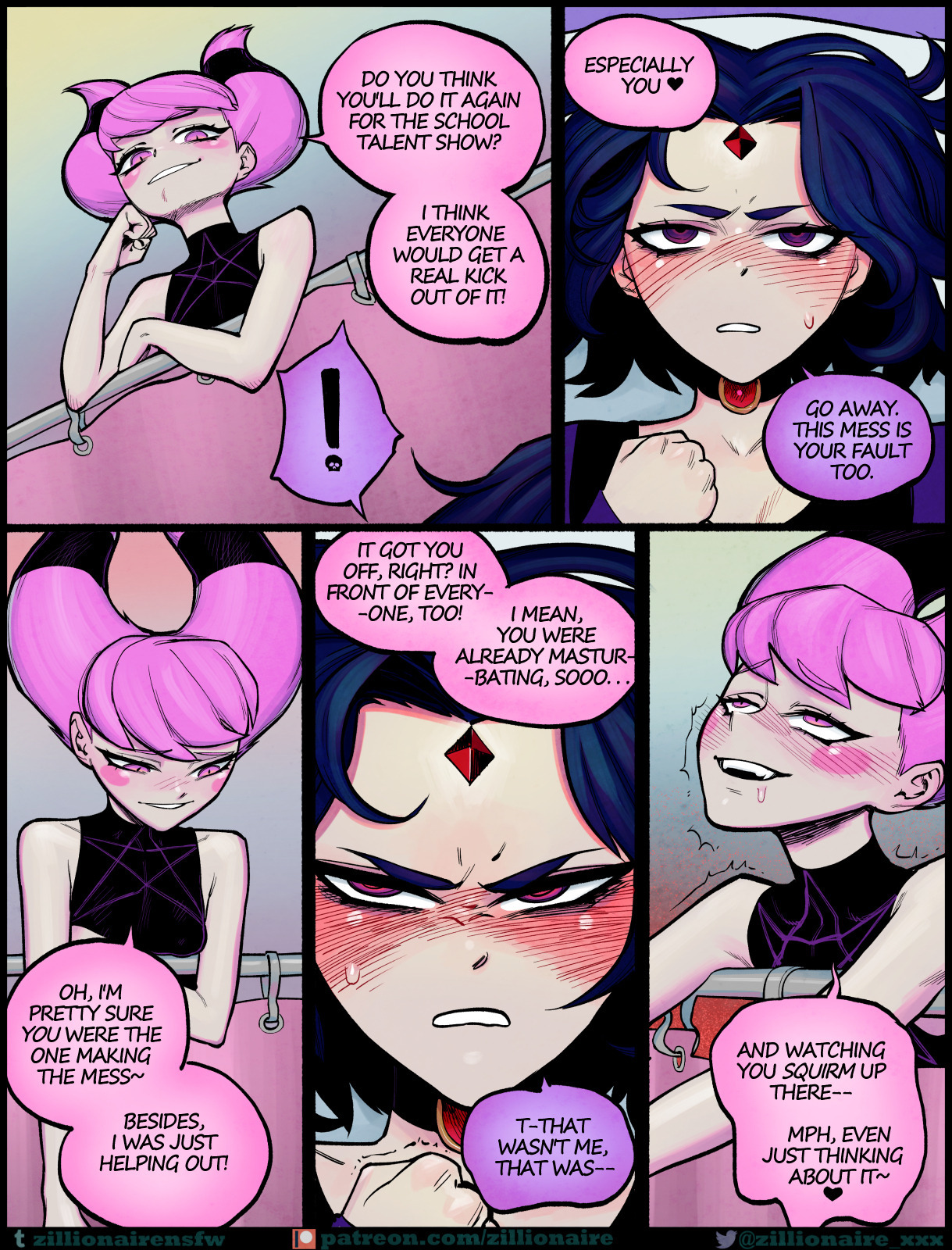 The next day, Raven confronts him for using her spells in such an inappropriate way. But Beast Boy activates the spell, and through telepathy, he begins to touch Raven, stimulating her, playing with her vagina, and giving her pleasure as Raven tries to restrain herself so that no one notices what she’s feeling.