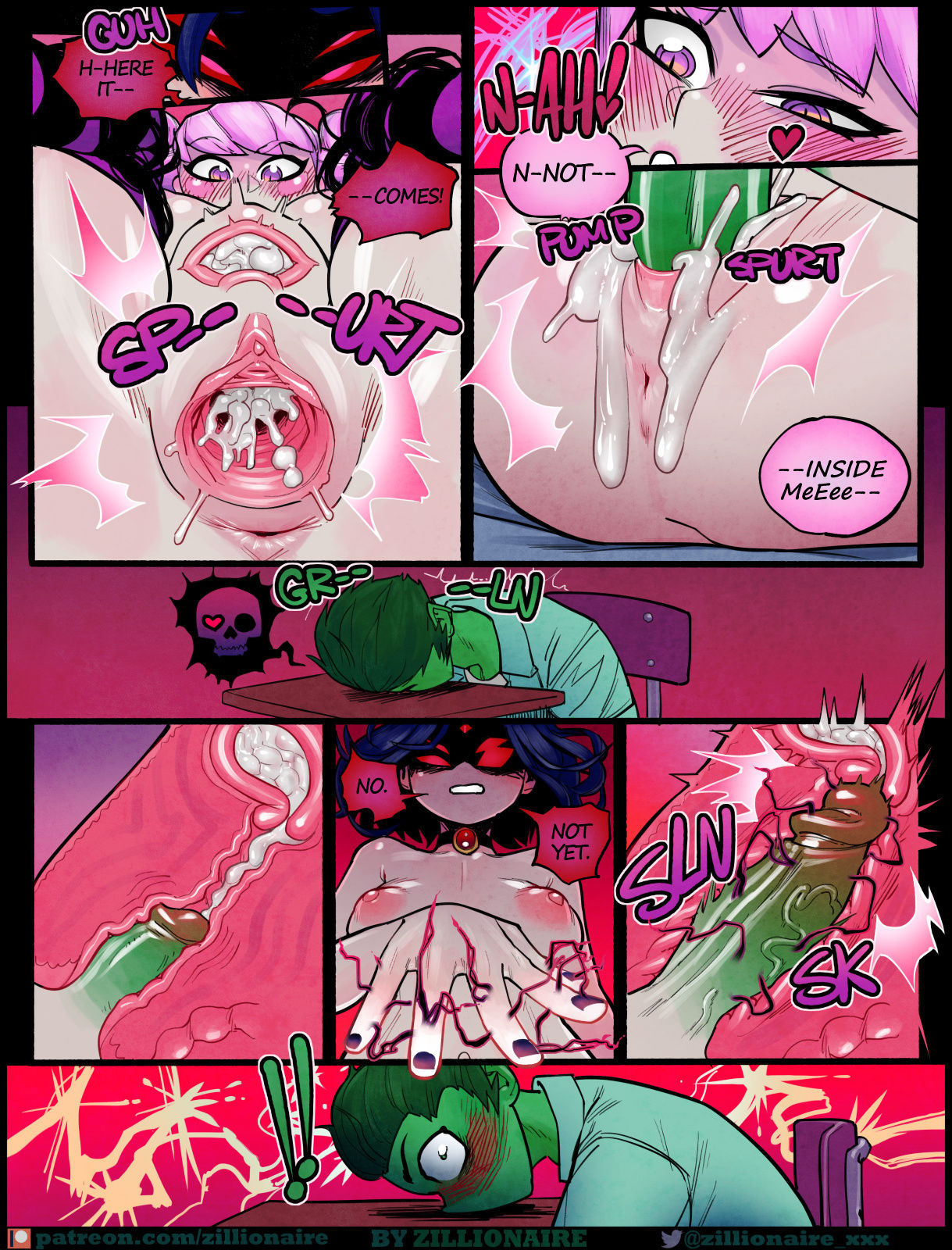 Raven stimulates Jinx, while Jinx continues sucking Beast Boy’s cock until he squirts inside her mouth, and Raven brings her to orgasm. But Raven doesn’t stop there, now angry, she grabs Jinx and penetrates her deeply, again and again, until she squirts nonstop inside her.